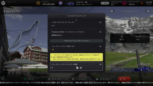 『グランツーリスモ7』においては、ゲーム側のFFBを最大に設定し、モーター側で強さを調整することで最も自然なフィーリングが得られることを確認しました。