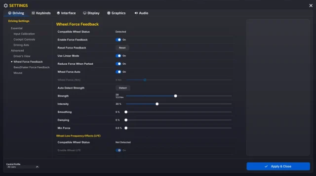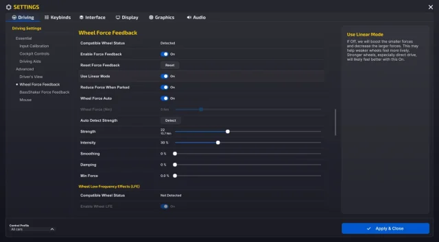 iRacingでは、FFBを100%、NDPを15%とし、ゲーム側のStrength値を調整することで高い操作性を確認しました。